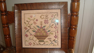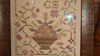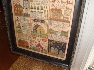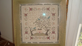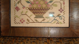 The last project I'm stitching with an online friend is Blackbird Designs' 2011 Loose Feathers series, Summer, Autumn, and Winter, all stitched on one piece of linen...I think I used the called for R& R 30 count Irish Creme. It's been a long time since I bought it....I am using all of the called for threads. I have been working on this since the charts came out, fairly regularly. I recently saw where my good friend Lois, of Needles, Pins and Stitching Things, had begun working on her sampler again after a hiatus. So, we have decided to stitch along for moral support.
